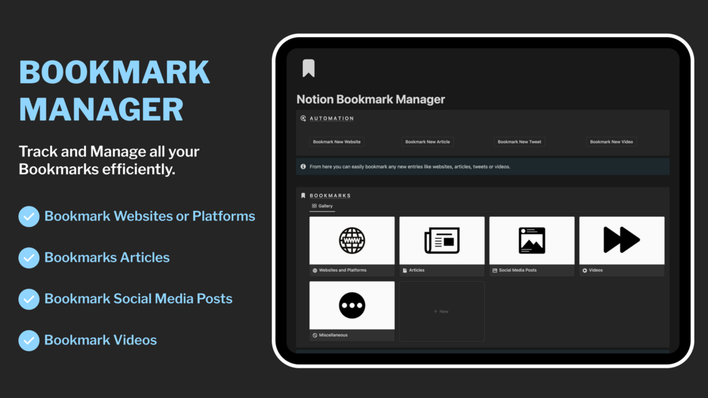 The Notion Bookmark Manager template is for people who want to save and manage all their bookmarks at a single place efficiently using Notion.