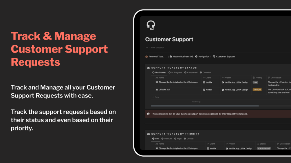 - Add or update Customer Support Requests and track them based on their status and priority.