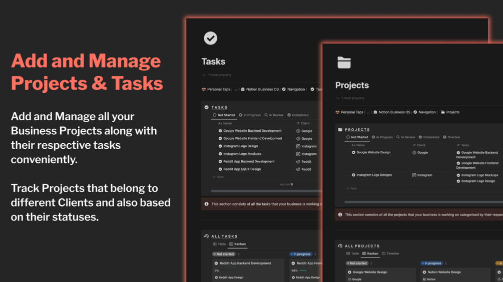 - Add or remove the Projects related to your Business. Track all the Tasks present inside a Project, track their respective statuses and timelines.