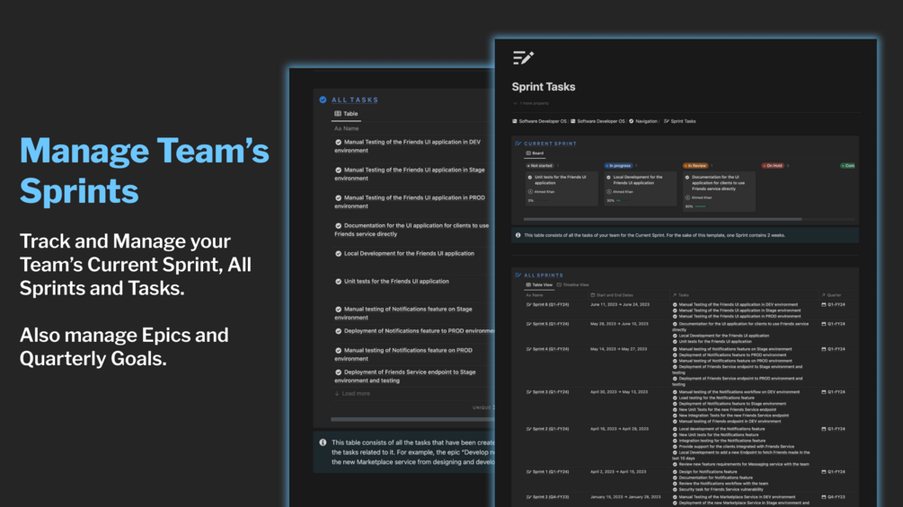 • Track all of your Team's Tasks, Sprints, Epics and Quarterly Goals.