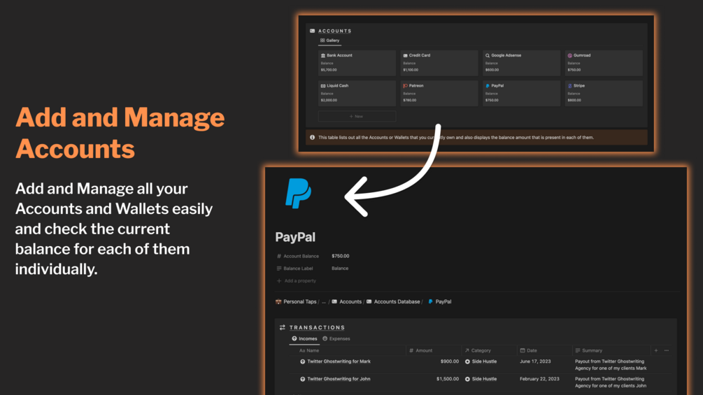 - Add and Manage your Accounts and Wallets.